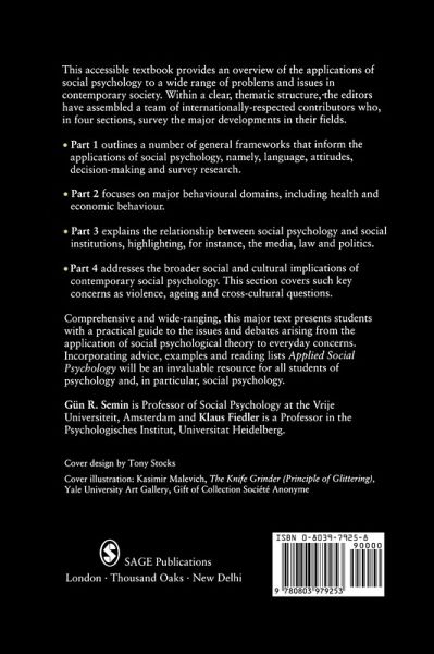The first part of the book outlines a number of general frameworks that inform the applications of social psychology, namely language, attitudes, decision-making and survey research; Part Two focuses on major behavioural domains, including health and economic behaviour; Part Three explains the relationship between social psychology and social institutions, highlighting, for instance, the media, law and politics; and the final part addresses the broader social and cultural implications of contemporary social psychology, covering such key concerns as violence, ageing and cross-cultural questions.
