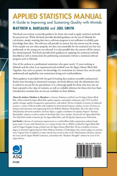 This book was written to provide guidance for those who need to apply statistical methods for practical use. While the book provides detailed guidance on the use of Minitab for calculation, simply entering data into a software program is not sufficient to reliably gain knowledge from data. The software will provide an answer, but the answer may be wrong if the sample was not taken properly, the data was unsuitable for the statistical test that was performed, or the wrong test was selected. It is also possible that the answer will be correct, but misinterpreted. This book provides both guidance in applying the statistical methods described as well as instructions for performing calculations without a statistical software program such as Minitab. One of the authors is a professional statistician who spent nearly 13 years working at Minitab and the other is an experienced and certified Lean Six Sigma Master Black Belt. Together, they strive to present the knowledge of a statistician in a format that can be easily understood and applied by non-statisticians facing real-world problems. Their guidance is provided with the goal of making data analysis accessible and practical. Rather than focusing on theoretical concepts, the book delivers only the information that is critical to success for the practitioner. It is a thorough guide for those who have not yet been exposed to the value of statistics, as well as a reliable reference for those who have been introduced to statistics but are not yet confident in their abilities. Supplemental files available! If you are an instructor who would like to conduct training with this book, please visit this "https://asqassets.widencollective.com/portals/sybdffda/(H1550)AppliedStatisticsManualAGuidetoImprovingandSustainingQualitywithMinitab" access: Course descriptions for one or two semester university courses Chapter descriptions for standalone sessions A data file containing data sets used in the book