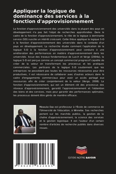 La fonction d'approvisionnement des universités dans la plupart des pays en développement n'a pas fait l'objet de recherches approfondies. Dans le cadre de la fonction d'approvisionnement, le rôle de la logique à dominante service (SD) suscite un intérêt croissant. Cette thèse applique la logique S-D à la fonction d'approvisionnement des universités dans le contexte d'un pays en développement. La recherche étudie comment l'application de la logique S-D à la fonction d'approvisionnement peut conduire à une amélioration des performances en matière d'approvisionnement dans les universités. Issue des travaux fondamentaux de Lusch et Vargo (2004a), la logique S-D est perçue comme un concept commercial progressif capable de créer de la valeur en transformant les processus et les pratiques commerciales. Les partisans de la logique S-D soutiennent que les entreprises ne possédant pas toutes les ressources nécessaires pour être productives, il est nécessaire de collaborer avec d'autres acteurs dans le cadre d'engagements commerciaux pour avoir un accès partagé aux ressources afin de créer conjointement de la valeur (Vargo, 2008). La fonction d'approvisionnement, qui est un élément clé des processus des réseaux d'approvisionnement, garantit l'approvisionnement et l'obtention des biens et des services, mais pour garantir des performances optimales, les processus doivent être gérés de manière efficace.