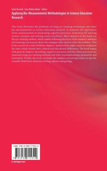 This book illustrates the problems of using eye tracking technology and other bio-measurements in science education research. It examines the application of bio-measurements in researching cognitive processes, motivation for learning science concepts, and solving science problems. Most chapters of this book use the eye-tracking method, which enables following the focus of the students' attention and drawing conclusions about the strategies they used to solve the problem. This book consists of a total of fifteen chapters. Authors from eight countries emphasise the same trends despite their cultural and educational differences. The book begins with general chapters describing cognitive processes and how these processes are measured using eye-tracking methods and other psychophysiology parameters and motivation. Finally, the book concludes the chapters presenting studies in specific scientific fields from chemistry, biology, physics and geology.