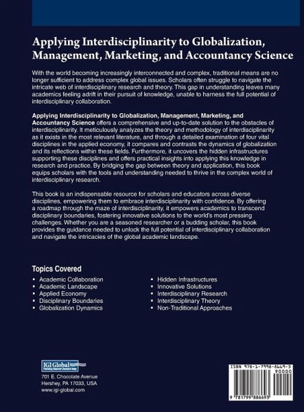 With the world becoming increasingly interconnected and complex, traditional means are no longer sufficient to address complex global issues. Scholars often struggle to navigate the intricate web of interdisciplinary research and theory. This gap in understanding leaves many academics feeling adrift in their pursuit of knowledge, unable to harness the full potential of interdisciplinary collaboration. Applying Interdisciplinarity to Globalization, Management, Marketing, and Accountancy Science offers a comprehensive and up-to-date solution to the obstacles of interdisciplinarity. It meticulously analyzes the theory and methodology of interdisciplinarity as it exists in the most relevant literature, and through a detailed examination of four vital disciplines in the applied economy, it compares and contrasts the dynamics of globalization and its reflections within these fields. Furthermore, it uncovers the hidden infrastructures supporting these disciplines and offers practical insights into applying this knowledge in research and practice. This book is an indispensable resource for scholars and educators across diverse disciplines, empowering them to embrace interdisciplinarity with confidence.