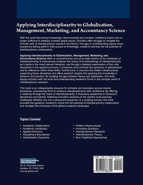 With the world becoming increasingly interconnected and complex, traditional means are no longer sufficient to address complex global issues. Scholars often struggle to navigate the intricate web of interdisciplinary research and theory. This gap in understanding leaves many academics feeling adrift in their pursuit of knowledge, unable to harness the full potential of interdisciplinary collaboration. Applying Interdisciplinarity to Globalization, Management, Marketing, and Accountancy Science offers a comprehensive and up-to-date solution to the obstacles of interdisciplinarity. It meticulously analyzes the theory and methodology of interdisciplinarity as it exists in the most relevant literature, and through a detailed examination of four vital disciplines in the applied economy, it compares and contrasts the dynamics of globalization and its reflections within these fields. Furthermore, it uncovers the hidden infrastructures supporting these disciplines and offers practical insights into applying this knowledge in research and practice. This book is an indispensable resource for scholars and educators across diverse disciplines, empowering them to embrace interdisciplinarity with confidence.