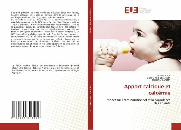 L'objectif principal de cette étude est d'évaluer l'état nutritionnel, l'apport calcique, et le rôle du calcium dans la prévention de la surcharge pondérale chez un groupe d'enfants à Tébessa. Les résultats montrent que 11,5% des enfants souffrent d'émaciation, le retard de croissance touche 28% des enfants et l'insuffisance pondérale 13,5% d'entre eux. La surcharge pondérale est retrouvée chez 32,5% de la population totale. Le surpoids seul touche 17% des enfants et l'obésité 15,5% d'entre eux. Elle est significativement associée aux facteurs endogènes et parentaux, notamment l'obésité maternelle, un GPG excessif et le diabète gestationnel. Pour les facteurs sociaux et environnementaux, seul le faible niveau d'instruction de la mère semble avoir une influence sur la corpulence des enfants. Concernant les facteurs alimentaires, un allaitement artificiel, un âge précoce d'introduction des aliments et un faible apport en calcium sont les principaux facteurs de risque du surpoids et de l'obésité.