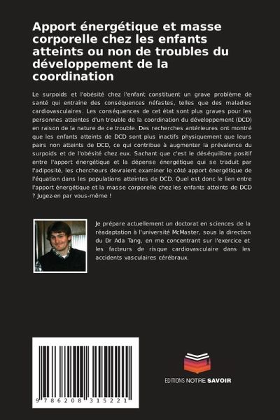 Le surpoids et l'obésité chez l'enfant constituent un grave problème de santé qui entraîne des conséquences néfastes, telles que des maladies cardiovasculaires. Les conséquences de cet état sont plus graves pour les personnes atteintes d'un trouble de la coordination du développement (DCD) en raison de la nature de ce trouble. Des recherches antérieures ont montré que les enfants atteints de DCD sont plus inactifs physiquement que leurs pairs non atteints de DCD, ce qui contribue à augmenter la prévalence du surpoids et de l'obésité chez eux. Sachant que c'est le déséquilibre positif entre l'apport énergétique et la dépense énergétique qui se traduit par l'adiposité, les chercheurs devraient examiner le côté apport énergétique de l'équation dans les populations atteintes de DCD. Quel est donc le lien entre l'apport énergétique et la masse corporelle chez les enfants atteints de DCD ? Jugez-en par vous-même !