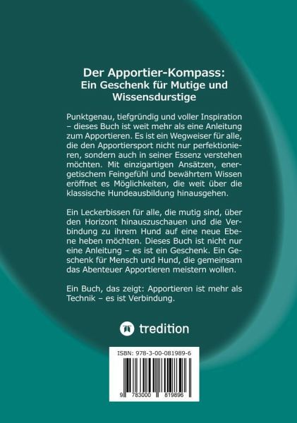 Der Apportier-Kompass: Ein Geschenk für Mutige und WissensdurstigePunktgenau, tiefgründig und voller Inspiration - dieses Buch ist weit mehr als eine Anleitung zum Apportieren. Es ist ein Wegweiser für alle, die den Apportiersport nicht nur perfektionieren, sondern auch in seiner Essenz verstehen möchten. Mit einzigartigen Ansätzen, energetischem Feingefühl und bewährtem Wissen eröffnet es Möglichkeiten, die weit über die klassische Hundeausbildung hinausgehen.Ein Leckerbissen für alle, die mutig sind, über den Horizont hinauszuschauen und die Verbindung zu ihrem Hund auf eine neue Ebene heben möchten. Dieses Buch ist nicht nur eine Anleitung - es ist ein Geschenk. Ein Geschenk für Mensch und Hund, die gemeinsam das Abenteuer Apportieren meistern wollen. Ein Buch, das zeigt: Apportieren ist mehr als Technik - es ist Verbindung.