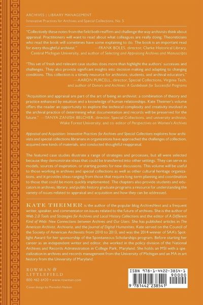 Appraisal and Acquisition: Innovative Practices for Archives and Special Collections explores how archivists and special collections librarians in organizations of different sizes and types have approached the challenges of collection, as well as exploring opportunities to acquire new kinds of materials and conduct thoughtful reappraisal.