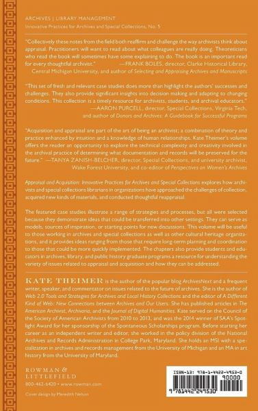 Appraisal and Acquisition: Innovative Practices for Archives and Special Collections explores how archivists and special collections librarians in organizations of different sizes and types have approached the challenges of collection, as well as exploring opportunities to acquire new kinds of materials and conduct thoughtful reappraisal.