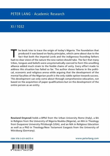 The book tries to trace the origin of today's Nigeria. The foundation that produced it was based on faulty principles, which came about due to the fact that both the imperial Lords and the indigenous founding fathers had no clear vision of the nature the new nation should take. The fact that many tribes, tongues and beliefs were unsystematically coerced to form this unwilling alliance added much strain to the feeble chains of unity. Every effort made to address this situation has failed so far. The author shows failures in the political, economic and religious arena while arguing that the development of the mental faculties of the Nigerian youth is the only viable option towards success. This development can only come about through comprehensive education, not based on the acquisition of paper qualifications but on the development of the entire person as an entity.