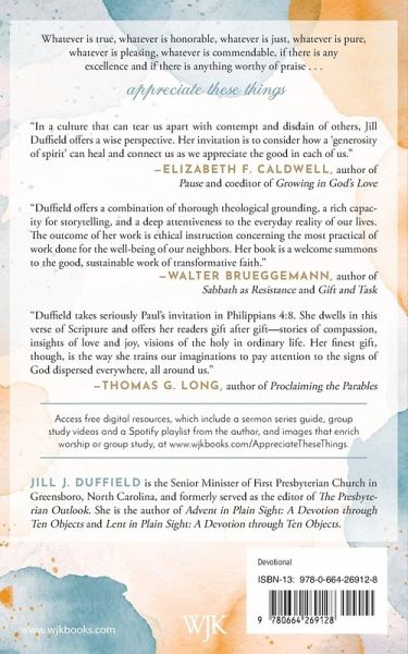 In a world tense with anger and division, how can we preserve our sense of well-being and inject a little more kindness into our daily interactions? Pastor Jill J. Duffield finds an answer in the apostle Paul's guidance in Philippians 4:8: "Whatever is true, whatever is honorable, whatever is just, whatever is pure, whatever is pleasing, whatever is commendable, if there is any excellence and if there is anything worthy of praise, think about these things." Thinking about, looking for, appreciating these eight things can reorient our hearts and minds in ways that nurture compassion for ourselves, those in need, and those with whom we are inclined to disagree. Duffield leads the way with stories and insights that will transform your outlook on the world-and maybe even the world itself. With eight chapters of five reflections each, Appreciate These Things can serve as a daily devotional, an eight-week group study, or an accessible, inspirational individual read. Access free digital resources, which include a sermon series guide, group study videos and a Spotify playlist from the author, and images that enrich worship or group study at www.wjkbooks.com/AppreciateTheseThings.