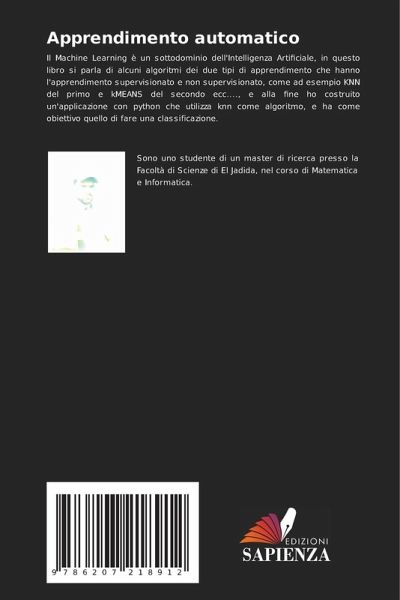 Il Machine Learning è un sottodominio dell'Intelligenza Artificiale, in questo libro si parla di alcuni algoritmi dei due tipi di apprendimento che hanno l'apprendimento supervisionato e non supervisionato, come ad esempio KNN del primo e kMEANS del secondo ecc...., e alla fine ho costruito un'applicazione con python che utilizza knn come algoritmo, e ha come obiettivo quello di fare una classificazione.