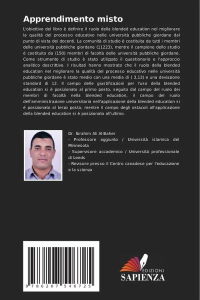 L'obiettivo del libro è definire il ruolo della blended education nel migliorare la qualità del processo educativo nelle università pubbliche giordane dal punto di vista dei docenti. La comunità di studio è costituita da tutti i membri delle università pubbliche giordane (11223), mentre il campione dello studio è costituito da (150) membri di facoltà delle università pubbliche giordane. Come strumento di studio è stato utilizzato il questionario e l'approccio analitico descrittivo. I risultati hanno mostrato che il ruolo della blended education nel migliorare la qualità del processo educativo nelle università pubbliche giordane è stato medio con una media di ( 3,13) e una deviazione standard di 12. Il campo delle giustificazioni per l'uso della blended education si è posizionato al primo posto, seguito dal campo del ruolo dei membri di facoltà nella blended education, il campo del ruolo dell'amministrazione universitaria nell'applicazione della blended education si è posizionato al terzo posto, mentre il campo degli ostacoli all'applicazione della blended education si è posizionato all'ultimo.
