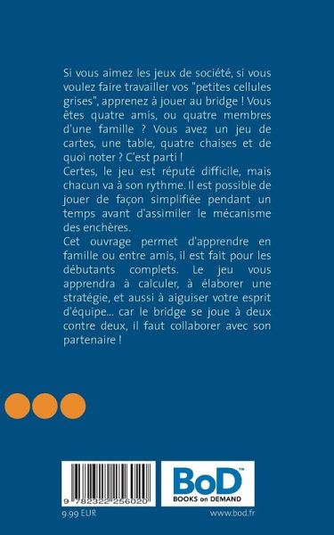 Si vous aimez les jeux de société, si vous voulez faire travailler vos "petites cellules grises", apprenez à jouer au bridge ! Vous êtes quatre amis, ou quatre membres d'une famille ? Vous avez un jeu de cartes, une table, quatre chaises et de quoi noter ? C'est parti !Certes, le jeu est réputé difficile, mais chacun va à son rythme. Il est possible de jouer de façon simplifiée pendant un temps avant d'assimiler le mécanisme des enchères.Cet ouvrage permet d'apprendre en famille ou entre amis, il est fait pour les débutants complets. Le jeu vous apprendra à calculer, à élaborer une stratégie, et aussi à aiguiser votre esprit d'équipe... car le bridge se joue à deux contre deux, il faut collaborer avec son partenaire !