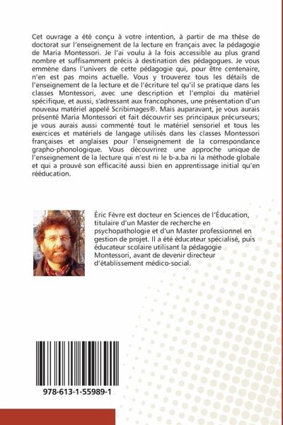 Cet ouvrage a été conçu à votre intention, à partir de ma thèse de doctorat sur l'enseignement de la lecture en français avec la pédagogie de Maria Montessori. Je l'ai voulu à la fois accessible au plus grand nombre et suffisamment précis à destination des pédagogues. Je vous emmène dans l'univers de cette pédagogie qui, pour être centenaire, n'en est pas moins actuelle. Vous y trouverez tous les détails de l'enseignement de la lecture et de l'écriture tel qu'il se pratique dans les classes Montessori, avec une description et l'emploi du matériel spécifique, et aussi, s'adressant aux francophones, une présentation d'un nouveau matériel appelé Scribimages®. Mais auparavant, je vous aurais présenté Maria Montessori et fait découvrir ses principaux précurseurs; je vous aurais aussi commenté tout le matériel sensoriel et tous les exercices et matériels de langage utilisés dans les classes Montessori françaises et anglaises pour l'enseignement de la correspondance grapho-phonologique. Vous découvrirez une approche unique de l'enseignement de la lecture qui n'est ni le b-a.ba ni la méthode globale et qui a prouvé son efficacité aussi bien en apprentissage initial qu'en rééducation.