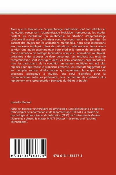 Alors que les théories de l'apprentissage multimédia sont bien établies et les études concernant l'apprentissage individuel nombreuses, les études portant sur l'utilisation du multimédia en situation d'apprentissage collaboratif assisté par ordinateur sont beaucoup moins représentées. En partant des études sur les animations multimédia, nous nous intéressons aux processus impliqués dans des situations collaboratives. Nous avons conduit une étude expérimentale pour étudier le format de présentation d'une animation de biologie (animation unique vs. animations multiples), présentée à des groupes de deux personnes. Les résultats aux tests de compréhension sont identiques dans les deux conditions expérimentales, mais les participants de la condition animations multiples ont été plus rapides pour apprendre le processus présenté. Les résultats suggèrent que les multiples sources d'information, qui reprenaient les étapes clé du processus biologique à étudier, ont servi d'artefact pour la communication entre les partenaires, leur permettant de construire plus rapidement une représentation partagée du thème à étudier.
