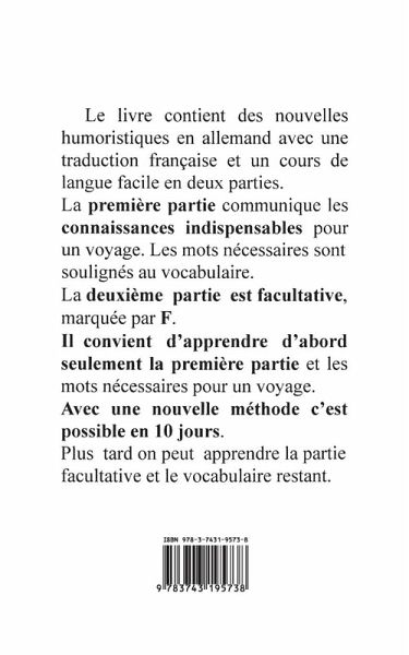 Le livre contient des nouvelles humoristiques en allemand avec une traduction francaise et un cours de langue facile en deux parties.La premiere partie communique les connaissances indispensables pour un voyage. Les mots necessaires sont soulignes au vocabulaire.La deuxieme partie est facultative, marquee par F.II convient d'apprendre d'abord seulement la premiere partie et les mots necessaires pour un voyage. Avec une nouvelle methode c'est possible en 10 jours.Plus tard on peut apprendre la partie facultative et le vocabulaire restant.