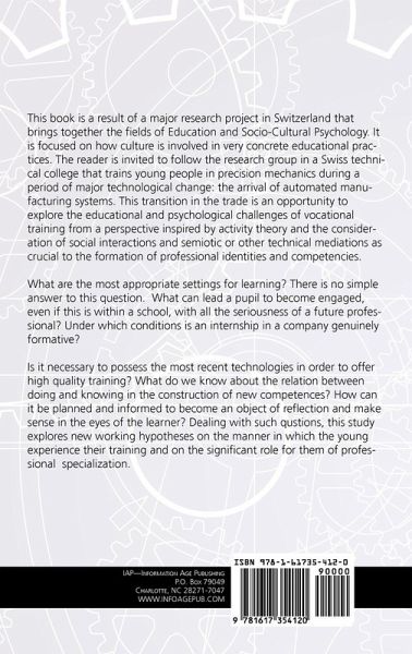A volume in Advances in Cultural Psychology Series Editor: Jaan Valsiner, Clark University This book is a result of a major research project in Switzerland that brings together the fields of Education and Socio-Cultural Psychology. It is focused on how culture is involved in very concrete educational practices. The reader is invited to follow the research group in a Swiss technical college that trains young people in precision mechanics during a period of major technological change: the arrival of automated manufacturing systems. This transition in the trade is an opportunity to explore the educational and psychological challenges of vocational training from a perspective inspired by activity theory and the consideration of social interactions and semiotic or other technical mediations as crucial to the formation of professional identities and competencies. What are the most appropriate settings for learning? There is no simple answer to this question. What can lead a pupil to become engaged, even if this is within a school, with all the seriousness of a future professional? Under which conditions is an internship in a company genuinely formative? Is it necessary to possess the most recent technologies in order to offer high quality training? What do we know about the relation between doing and knowing in the construction of new competences? How can it be planned and informed to become an object of reflection and make sense in the eyes of the learner? Dealing with such questions, this study explores new working hypotheses on the manner in which the young experience their training and on the significant role for them of professional specialization.