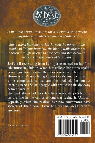 A secret life is just as much a burden as a secret identity... Jori's still recovering from her injuries earned on her first adventure in Unipuri when her college life turns upside down. While losing her pain-in-the-neck roommate is good news, she also loses the good one. Two friends in her dormitory rescue her from the dilemma of taking new roommates, and share their dorm room with her. Nothing in the world can compel Jori to mess up her new dorm situation. However, she's now living in two worlds, and, as a result, some complications just can't be avoided. Jori enjoys learning to be a Solar, charged with protecting the doorway between worlds. The time differential between the Midworld and Earth is a big help in getting her homework done. She can't always hide her dual lives, when she puts her life on the line in the centuries-long war raging in Unipuri. Especially when she realizes her new roommates have secrets of their own. Even her dreams aren't private anymore. Enemies of the Solars target Jori and manage to follow her from Unipuri to Earth with their magic, threatening her life and the ones she loves most. She was warned and trained, but at the end of the day, she's still just a college freshman.