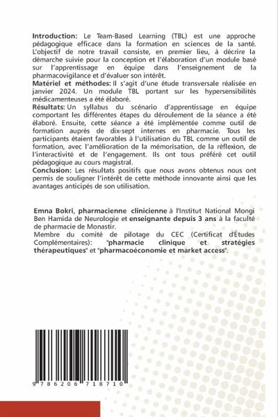 Introduction: Le Team-Based Learning (TBL) est une approche pédagogique efficace dans la formation en sciences de la santé. L'objectif de notre travail consiste, en premier lieu, à décrire la démarche suivie pour la conception et l'élaboration d'un module basé sur l'apprentissage en équipe dans l'enseignement de la pharmacovigilance et d'évaluer son intérêt.Matériel et méthodes: Il s'agit d'une étude transversale réalisée en janvier 2024. Un module TBL portant sur les hypersensibilités médicamenteuses a été élaboré. Résultats: Un syllabus du scénario d'apprentissage en équipe comportant les différentes étapes du déroulement de la séance a été élaboré. Ensuite, cette séance a été implémentée comme outil de formation auprès de dix-sept internes en pharmacie. Tous les participants étaient favorables à l'utilisation du TBL comme un outil de formation, avec l'amélioration de la mémorisation, de la réflexion, de l'interactivité et de l'engagement. Ils ont tous préféré cet outil pédagogique au cours magistral. Conclusion: Les résultats positifs que nous avons obtenus nous ont permis de souligner l'intérêt de cette méthode innovante ainsi que les avantages anticipés de son utilisation.