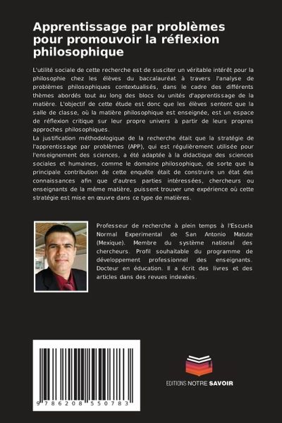 L'utilité sociale de cette recherche est de susciter un véritable intérêt pour la philosophie chez les élèves du baccalauréat à travers l'analyse de problèmes philosophiques contextualisés, dans le cadre des différents thèmes abordés tout au long des blocs ou unités d'apprentissage de la matière. L'objectif de cette étude est donc que les élèves sentent que la salle de classe, où la matière philosophique est enseignée, est un espace de réflexion critique sur leur propre univers à partir de leurs propres approches philosophiques. La justification méthodologique de la recherche était que la stratégie de l'apprentissage par problèmes (APP), qui est régulièrement utilisée pour l'enseignement des sciences, a été adaptée à la didactique des sciences sociales et humaines, comme le domaine philosophique, de sorte que la principale contribution de cette enquête était de construire un état des connaissances afin que d'autres parties intéressées, chercheurs ou enseignants de la même matière, puissent trouver une expérience où cette stratégie est mise en oeuvre dans ce type de matières.