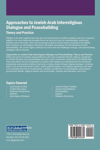 Religion in its most negative form has and can be the basis of conflict escalation and terror. However, religion in its more noble and elevated forms can also be a force for peacebuilding, particularly between Jews and Arabs. If the slow but steady progress toward Israel's acceptance into Middle East continues, an interreligious dimension will clearly accompany it as the Abraham Accords demonstrates. Yet, as the region continues to evolve and new challenges emerge, new peacebuilding strategies will be required. Approaches to Jewish-Arab Interreligious Dialogue and Peacebuilding: Theory and Practice follows the genre of scholars and practitioners who have contended that the religious contribution to conflict resolution and peacebuilding has been sorely overlooked, particularly in the Middle East. This book delves into the complexities of Jewish-Arab relations by examining both the theoretical frameworks and practical initiatives that seek to bridge divides through religious dialogue. Covering topics such as the Arab-Israeli conflict, Jewish political tradition, and religious diplomacy, this book is an essential resource for academicians, scholars, practitioners in peacebuilding, policymakers, government officials, religious leaders and communities, students and educators, and more.