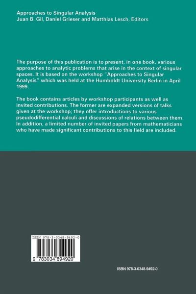 The purpose of this publication is to present, in one book, various approaches to analytic problems that arise in the context of singular spaces. It is based on the workshop 'Approaches to Singular Analysis' which was held on April 8-10, 1999, at Humboldt University of Berlin. The aim of this workshop was to bring together young mathematicians interested in partial differential operators on singular con figurations. The main idea was to look at different approaches that have been proposed, and try to understand to which extent they overlap and how they differ. The workshop took place in a rather relaxed atmosphere. The participants appreciated that there was a discussion session every day, which gave a lot of room for an open exchange of ideas. This book contains articles by workshop participants and invited contributions. The former are expanded versions of talks at the workshop; they give introductions to various pseudodifferential calculi and discussions of relations between them. In addition, we invited a limited number of papers from mathematicians who have made significant contributions to this field. Unfortunately, several of these invita tions were turned down due to other commitments. For this reason, only a very small number of contributions from non-participants remain. The absence of any particular name from the list of (invited) contributors should not be interpreted as a bias of the editors against that scientist. It rather reflects our restricted choice of invitations due to lack of space.