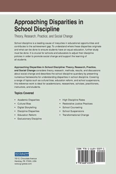 School discipline is a leading cause of inequities in educational opportunities and contributes to the achievement gap. To understand where these disparities originate and what can be done to ensure students have an equal education, further study must be done. It is crucial for schools and educators to adjust their discipline policies in order to promote social change and support the learning of all students. Approaching Disparities in School Discipline: Theory, Research, Practice, and Social Change considers theory, research, methods, results, and discussions about social change and describes the school discipline quandary by presenting numerous frameworks for understanding disparities in school discipline. Covering a range of topics such as cultural bias, education reform, and school suspensions, this reference work is ideal for academicians, researchers, scholars, practitioners, instructors, and students.