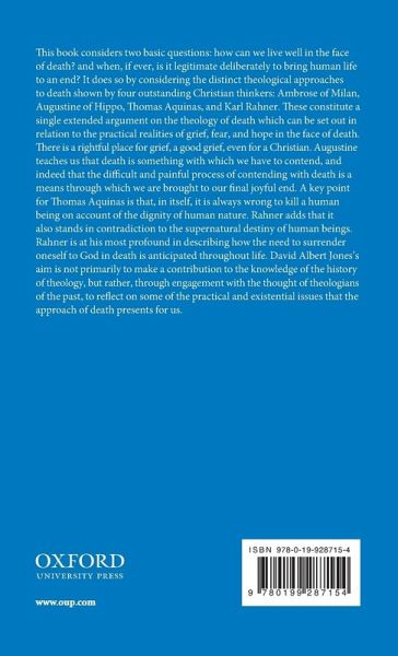 David Albert Jones considers two basic questions: how can we live well in the face of death? and when, if ever, is it legitimate deliberately to bring human life to an end? He focuses upon the distinct theological approaches to death shown by four outstanding Christian thinkers: Ambrose of Milan, Augustine of Hippo, Thomas Aquinas, and Karl Rahner. Jones's aim is not primarily to make a contribution to the history of theology, but rather, through engagement with the thought of theologians of the past, to reflect on some of the practical and existential issues that the approach of death presents for all of us.