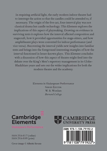 In requiring artificial light, the early modern indoor theatre had to interrupt the action so that the candles could be attended to, if necessary. This Element explores how the interval affected composition and stagecraft and how amphitheatre plays were converted for indoor performance (and vice versa).