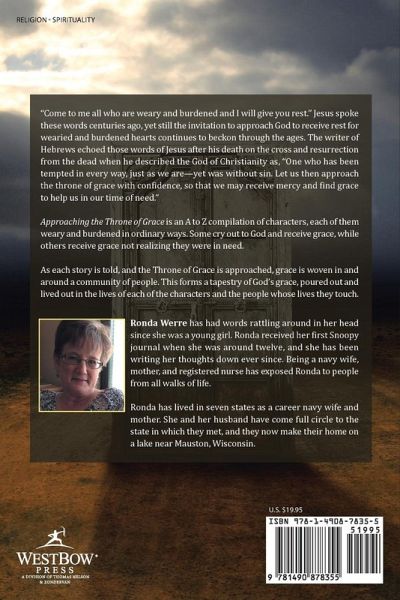 "Come to me all who are weary and burdened and I will give you rest." Jesus spoke these words centuries ago, yet still the invitation to approach God to receive rest for wearied and burdened hearts continues to beckon through the ages. The writer of Hebrews echoed those words of Jesus after his death on the cross and resurrection from the dead when he described the God of Christianity as, "One who has been tempted in every way, just as we are—yet was without sin. Let us then approach the throne of grace with confidence, so that we may receive mercy and find grace to help us in our time of need." Approaching the Throne of Grace is an A to Z compilation of characters, each of them weary and burdened in ordinary ways. Some cry out to God and receive grace, while others receive grace not realizing they were in need. As each story is told, and the Throne of Grace is approached, grace is woven in and around a community of people. This forms a tapestry of God’s grace, poured out and lived out in the lives of each of the characters and the people whose lives they touch.