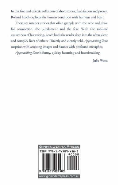 'In this fine and eclectic collection of short stories, flash fiction and poetry, Roland Leach explores the human condition with humour and heart. These are interior stories that often grapple with the ache and drive for connection, the puzzlement and the fear. With the sublime assuredness of his writing Leach leads the reader deep into the often silent and complex lives of others. Directly and cleanly told, Approaching Zero surprises with arresting images and haunts with profound metaphor. Approaching Zero is funny, quirky, haunting and heartbreaking.' - Julie Watts