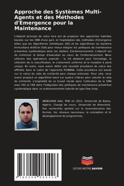 L'objectif principal de notre livre est de proposer des approches hybrides basées sur les SMA d'une part, et l'exploitation des méthodes d'émergence telles que les Algorithmes Génétiques (AG) et les algorithmes du Système Immunitaire Artificiel (SIA) pour mieux intégrer les politiques de maintenance préventive systématique dans les ateliers d'ordonnancement. L'objectif est de minimiser le temps d'exécution au cours de l'ordonnancement. Nous utilisons des opérateurs avancés : la clé aléatoire pour l'encodage, la sélection de la classification, le croisement uniforme et la mutation à point unique. En outre, nous avons défini une nouvelle procédure de calcul des affinités dans le cadre de l'approche FSHMAIA. Cette procédure est basée sur le calcul du ratio de similarité pour chaque anticorps. Pour cela, nous avons proposé un algorithme basé sur quatre critères pour calculer le ratio de similarité. L'originalité de ce travail réside dans l'utilisation de la SMA avec l'AG et l'AIS dans l'intégration des politiques de maintenance préventive systématique dans un ordonnancement hybride de type flow shop.