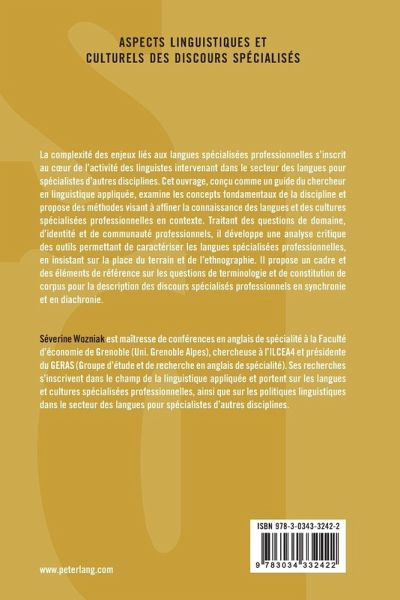 La complexité des enjeux liés aux langues spécialisées professionnelles s'inscrit au coeur de l'activité des linguistes intervenant dans le secteur des langues pour spécialistes d'autres disciplines. Cet ouvrage, conçu comme un guide du chercheur en linguistique appliquée, examine les concepts fondamentaux de la discipline et propose des méthodes visant à affiner la connaissance des langues et des cultures spécialisées professionnelles en contexte. Traitant des questions de domaine, d'identité et de communauté professionnels, il développe une analyse critique des outils permettant de caractériser les langues spécialisées professionnelles, en insistant sur la place du terrain et de l'ethnographie. Il propose un cadre et des éléments de référence sur les questions de terminologie et de constitution de corpus pour la description des discours spécialisés professionnels en synchronie et en diachronie.