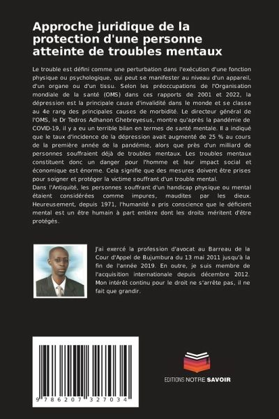 Le trouble est défini comme une perturbation dans l'exécution d'une fonction physique ou psychologique, qui peut se manifester au niveau d'un appareil, d'un organe ou d'un tissu. Selon les préoccupations de l'Organisation mondiale de la santé (OMS) dans ces rapports de 2001 et 2022, la dépression est la principale cause d'invalidité dans le monde et se classe au 4e rang des principales causes de morbidité. Le directeur général de l'OMS, le Dr Tedros Adhanon Ghebreyesus, montre qu'après la pandémie de COVID-19, il y a eu un terrible bilan en termes de santé mentale. Il a indiqué que le taux d'incidence de la dépression avait augmenté de 25 % au cours de la première année de la pandémie, alors que près d'un milliard de personnes souffraient déjà de troubles mentaux. Les troubles mentaux constituent donc un danger pour l'homme et leur impact social et économique est énorme. Cela signifie que des mesures doivent être prises pour soigner et protéger la victime souffrant d'un trouble mental.Dans l'Antiquité, les personnes souffrant d'un handicap physique ou mental étaient considérées comme impures, maudites par les dieux. Heureusement, depuis 1971, l'humanité a pris conscience que le déficient mental est un être humain à part entière dont les droits méritent d'être protégés.