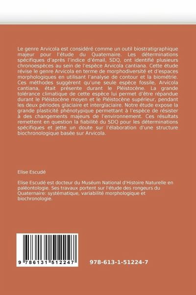 Le genre Arvicola est considéré comme un outil biostratigraphique majeur pour l étude du Quaternaire. Les déterminations spécifiques d après l indice d émail, SDQ, ont identifié plusieurs chronoespèces au sein de l espèce Arvicola cantiana. Cette étude révise le genre Arvicola en terme de morphodiversité et d espaces morphologiques en utilisant l analyse de contour et la biométrie. Ces méthodes suggèrent qu une seule espèce fossile, Arvicola cantiana, était présente durant le Pléistocène. La grande tolérance climatique de cette espèce lui permet d être répandue durant le Pléistocène moyen et le Pléistocène supérieur, pendant les deux périodes glaciaire et interglaciaire. Notre étude expose la grande plasticité phénotypique permettant à l espèce de résister à des changements majeurs de l environnement. Ces résultats remettent en question la fiabilité du SDQ pour les déterminations spécifiques et jette un doute sur l élaboration d une structure biochronologique basée sur Arvicola.