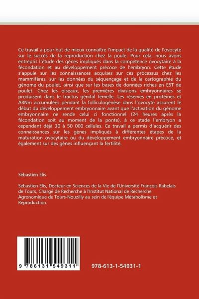 Ce travail a pour but de mieux connaître l'impact de la qualité de l'ovocyte sur le succès de la reproduction chez la poule. Pour cela, nous avons entrepris l'étude des gènes impliqués dans la compétence ovocytaire à la fécondation et au développement précoce de l'embryon. Cette étude s'appuie sur les connaissances acquises sur ces processus chez les mammifères, sur les données du séquençage et de la cartographie du génome du poulet, ainsi que sur les bases de données riches en EST de poulet. Chez les oiseaux, les premières divisions embryonnaires se produisent dans le tractus génital femelle. Les réserves en protéines et ARNm accumulées pendant la folliculogénèse dans l'ovocyte assurent le début du développement embryonnaire avant que l'activation du génome embryonnaire ne rende celui ci fonctionnel (24 heures après la fécondation soit au moment de la ponte), à ce stade l'embryon a cependant déjà 30 à 50 000 cellules. Ce travail a permis d'acquérir des connaissances sur les gènes impliqués à différentes étapes de la maturation ovocytaire ou du développement embryonnaire précoce, et également sur des gènes influençant la fertilité.