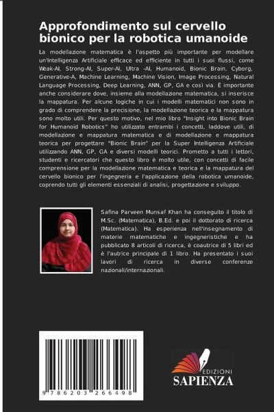 La modellazione matematica è l'aspetto più importante per modellare un'Intelligenza Artificiale efficace ed efficiente in tutti i suoi flussi, come Weak-AI, Strong-AI, Super-AI, Ultra -AI, Humanoid, Bionic Brain, Cyborg, Generative-A, Machine Learning, Machine Vision, Image Processing, Natural Language Processing, Deep Learning, ANN, GP, GA e così via. È importante anche considerare dove, insieme alla modellazione matematica, si inserisce la mappatura. Per alcune logiche in cui i modelli matematici non sono in grado di comprendere la precisione, la modellazione teorica e la mappatura sono molto utili. Per questo motivo, nel mio libro "Insight into Bionic Brain for Humanoid Robotics" ho utilizzato entrambi i concetti, laddove utili, di modellazione e mappatura matematica e di modellazione e mappatura teorica per progettare "Bionic Brain" per la Super Intelligenza Artificiale utilizzando ANN, GP, GA e diversi modelli teorici. Prometto a tutti i lettori, studenti e ricercatori che questo libro è molto utile, con concetti di facile comprensione per la modellazione matematica e teorica e la mappatura del cervello bionico per l'ingegneria e l'applicazione della robotica umanoide, coprendo tutti gli elementi essenziali di analisi, progettazione e sviluppo.