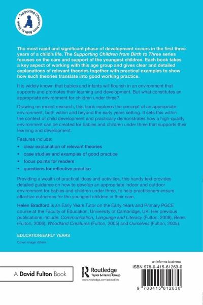 The most rapid and significant phase of development occurs in the first three years of a child's life. The Supporting Children from Birth to Three series focuses on the care and support of the youngest children. Each book takes a key aspect of working with this age group and gives clear and detailed explanations of relevant theories together with practical examples to show how such theories translate into good working practice. It is widely known that babies and infants will flourish in an environment that supports and promotes their learning and development. But what constitutes an appropriate environment for children under three? Drawing on recent research, this book explores the concept of an appropriate environment, both within and beyond the early years setting. It sets this within the context of child development and practically demonstrates how a high quality environment can be created for babies and children under three that supports their learning and development. Features include: clear explanation of relevant theories case studies and examples of good practice focus points for readers questions for reflective practice Providing a wealth of practical ideas and activities, this handy text provides detailed guidance on how to develop an appropriate indoor and outdoor environment for babies and children under three to help practitioners ensure effective outcomes for the youngest children in their care.