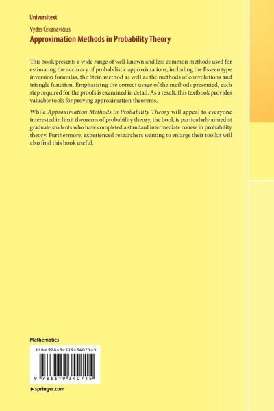 While Approximation Methods in Probability Theory will appeal to everyone interested in limit theorems of probability theory, the book is particularly aimed at graduate students who have completed a standard intermediate course in probability theory. Furthermore, experienced researchers wanting to enlarge their toolkit will also find this book useful.