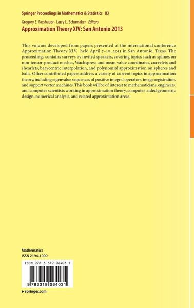 These proceedings were prepared in connection with the 14th International Conference on Approximation Theory, which was held April 7-10, 2013 in San Antonio, Texas. The conference was the fourteenth in a series of meetings in Approximation Theory held at various locations in the United States. The included invited and contributed papers cover diverse areas of approximation theory with a special emphasis on the most current and active areas such as compressed sensing, isogeometric analysis, anisotropic spaces, radial basis functions and splines. Classical and abstract approximation is also included. The book will be of interest to mathematicians, engineers\ and computer scientists working in approximation theory, computer-aided geometric design, numerical analysis and related application areas.