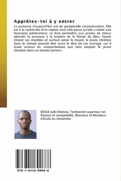 La jeunesse d'aujourd'hui est en perpetuelle reconstruction. Elle est à la recherche d'un repère, tout celà parce qu'elle a mené une mauvaise adolescnece. ce livre permettra aux jeunes de mieux aborder la jeunesse à la lumière de la Parole de Dieu; Savoir choisir ses modèles et surtout aimer le travail. le jeune chrétien dans le monde pourait être aussi le titre de cet ouvrage, car il traite surtout du comportement que dois adopter le jeune chretien dans un monde pervers.