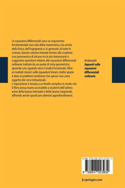 Le equazioni differenziali sono un argomento fondamentale non solo della matematica, ma anche della fisica, dell'ingegneria e, in generale, di tutte le scienze. Questo volume intende fornire allo studente una panoramica di alcune tra le più interessanti e suggestive questioni relative alle equazioni differenziali ordinarie trattate da un punto di vista geometrico, aprendo uno sguardo verso l'analisi funzionale. Oltre ai risultati classici sulle equazioni lineari, molto spazio è dato ai problemi nonlineari che spesso non sono oggetto dei corsi istituzionali.