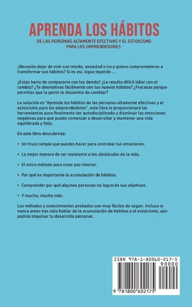 ¿Necesita dejar de vivir con miedo, ansiedad e ira y quiere comprometerse a transformar sus hábitos? Si es así, sigue leyendo ... ¿Estás harto de compararte con los demás? ¿Le resulta difícil lidiar con el cambio? ¿Te desmotivas fácilmente con tus nuevos hábitos? ¿Fracasas porque permites que la gente te desanime de cambiar? La solución es "Aprender los hábitos de las personas altamente efectivas y el estoicismo para los emprendedores", este libro le proporcionará las herramientas para finalmente ser autodisciplinado y disminuir las emociones negativas para que pueda comenzar a desarrollar y mantener una vida equilibrada y feliz. En este libro descubrirás:Un truco simple que puedes hacer para controlar tus emociones. La mejor manera de ser resistente a los obstáculos de la vida. El único método para crear paz interior. Por qué es importante la acumulación de hábitos. Comprender por qué algunas personas no lograrán sus objetivos. Y mucho, mucho más. Los métodos y conocimientos probados son muy fáciles de seguir. Incluso si nunca antes has oído hablar de la acumulación de hábitos o el estoicismo, aún podrás impulsar tu desarrollo personal. Por lo tanto, si desea dejar de distraerse, desarrollar hábitos positivos duraderos y comenzar a vivir la buena vida que desea, haga clic en "Comprar ahora" en la esquina superior derecha AHORA.