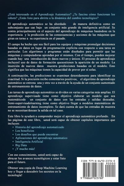 ¿Está interesado en el Aprendizaje Automatico? ¿Te fascina cómo funcionan los robots? ¿Estás listo para abrirte a la dinámica del cambio tecnológico? El aprendizaje automático se ha abordado de manera definitiva como un subconjunto que cae bajo un conjunto más grande de inteligencia artificial. Se centra principalmente en el aspecto del aprendizaje de máquinas basándose en la experiencia y la predicción de las consecuencias y acciones de las máquinas que giran en torno a su experiencia en el pasado. El campo ha hecho que sea fácil para los equipos y máquinas promulgar decisiones basadas en datos en lugar de programación explícita con respecto a una tarea en particular. Los algoritmos y programas están diseñados para permitir que las máquinas y computadoras aprendan por sí mismos. Con el tiempo, pueden mejorar cuando hay una introducción de datos nuevos y únicos. El proceso de aprendizaje incluyeel uso de datos de formación quesostienen la aparición de un modelo. La inserción de nuevos datos muestra predicciones basadas en el modelo. Esto significa que las máquinas tienen la capacidad de prever por sí solas. A continuación, las predicciones se examinan detenidamente para identificar su exactitud. Si la precisión recibe comentarios positivos, el algoritmo de aprendizaje automático se entrena una y otra vez a través de la ayuda de un conjunto aumentado de entrenamiento de datos. Las tareas de aprendizaje automático se dividen en varias categorías más amplias. El aprendizaje supervisado tiene como objetivo elaborar un modelo que sea matemáticode un conjunto de datos con las entradas y salidas deseadas. Semi-supervisadolearning tiene como objetivo llegar a modelos matemáticos de entrenamiento de datos incompleto. Se dará cuenta de que las entradas de muestra no se necesitan/desean la salida en tal caso. Este libro le ayudará a comprender mejor el aprendizaje automático profundo. En las páginas de este libro, usted será capaz de obtener capítulos importantes que incluyen: · Historia del aprendizaje automatizado · Los beneficios · Los desafíos que puede encontrar · Aplicaciones del aprendizaje automatico · Inteligencia Artificial · Big Data · ¡Y mucho más! Con ese conocimiento, usted será capaz de abrazar los avances tecnológicos y estar listo para el futuro. Obtener una copia de Deep Machine Learning hoy y llegar a descubrir los secretos en la tecnología!