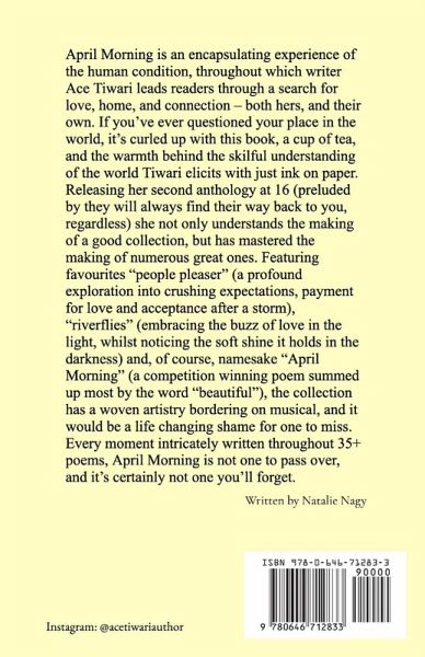 April Morning is an encapsulating experience of the human condition, throughout which writer Ace Tiwari leads readers through a search for love, home, and connection - both hers, and their own. If you've ever questioned your place in the world, it's curled up with this book, a cup of tea, and the warmth behind the skilful understanding of the world Tiwari elicits with just ink on paper. Releasing her second anthology at 16 (preluded by they will always find their way back to you, regardless) she not only understands the making of a good collection, but has mastered the making of numerous great ones. Featuring favourites "people pleaser" (a profound exploration into crushing expectations, payment for love and acceptance after a storm), "riverflies" (embracing the buzz of love in the light, whilst noticing the soft shine it holds in the darkness) and, of course, namesake "April Morning" (a competition winning poem summed up most by the word "beautiful"), the collection has a woven artistry bordering on musical, and it would be a life changing shame for one to miss. Every moment intricately written throughout 35+ poems, April Morning is not one to pass over, and it's certainly not one you'll forget. Written by Natalie Nagy