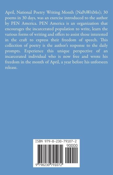 April, National Poetry Writing Month (NaPoWriMo); 30 poems in 30 days, was an exercise introduced to the author by PEN America. PEN America is an organization that encourages the incarcerated population to write, learn the various forms of writing and offers to assist those interested in the craft to express their freedom of speech. This collection of poetry is the author's response to the daily prompts. Experience this unique perspective of an incarcerated individual who is now free and wrote his freedom in the month of April, a year before his unforseen release.