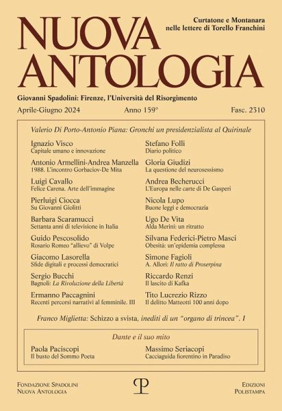 Valerio Di Porto-Antonio Piana: Gronchi un presidenzialista al Quirinale Ignazio Visco, Capitale umano e innovazione Antonio Armellini, Andrea Manzella, 1988. L'incontro Gorbaciov-De Mita Luigi Cavallo, Felice Carena. Arte dell'immagine Pierluigi Ciocca, Su Giovanni Giolitti Barbara Scaramucci, Settanta anni di televisione in Italia Guido Pescosolido, Rosario Romeo "allievo" di Volpe Giacomo Lasorella, Sfide digitali e processi democratici Sergio Bucchi, Bagnoli: La rivoluzione della libertà Ermanno Paccagnini, Recenti percorsi narrativi al femminile. III Stefano Folli, Diario politico Gloria Giudizi, La questione del neuro sessismo Andrea Becherucci, L'Europa nelle carte di De Gasperi Nicola Lupo, Buone leggi e democrazia Ugo De Vita, Alda Merini: un ritrattoSilvana Federici, Pietro Masci, Obesità un'epidemia complessa Simone Fagioli, A. Allori: Il ratto di Proserpina Riccardo Renzi, Il lascito di Kafka Tito Lucrezio Rizzo, Il delitto Matteotti 100 anni dopo Franco Miglietta, Schizzo a svista, inediti di un "organo di trincea". I Dante e il suo mito Paola Paciscopi, Il busto del Sommo Poeta Massimo Seriacopi, Cacciaguida fiorentino in Paradiso