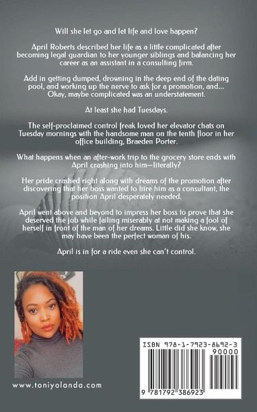 Will she let go and let life and love happen? April Roberts described her life as a little complicated after becoming legal guardian to her younger siblings and balancing her career as an assistant in a consulting firm. Add in getting dumped, drowning in the deep end of the dating pool, and working up the nerve to ask for a promotion, and... Okay, maybe complicated was an understatement. At least she had Tuesdays. The self-proclaimed control freak loved her elevator chats on Tuesday mornings with the handsome man on the tenth floor in her office building, Braeden Porter. What happens when an after work trip to the grocery store ends with April crashing into him-literally? Her pride crashed right along with dreams of the promotion after discovering that her boss wanted to hire him as a consultant, the position April desperately needed. April went above and beyond to impress her boss to prove that she deserved the job, while failing miserably at not making a fool of herself in front of the man of her dreams. Little did she know, she may have been the perfect woman of his. April is in for a ride even she can't control. Content Warning: Please note that this book contains sensitive topics listed below. It is also intended for audiences 18 years and older. Grief Addiction Mental Health Content