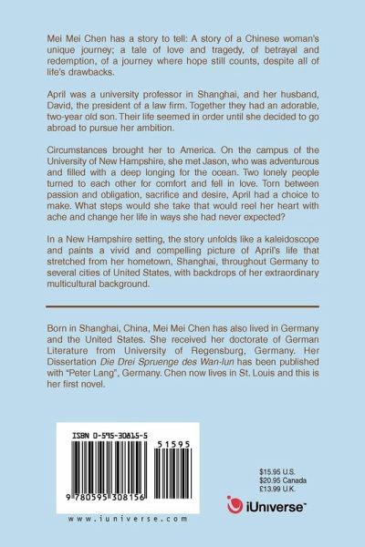 Mei Mei Chen has a story to tell: A story of a Chinese woman's unique journey; a tale of love and tragedy, of betrayal and redemption, of a journey where hope still counts, despite all of life's drawbacks. April was a university professor in Shanghai, and her husband, David, the president of a law firm. Together they had an adorable, two-year old son. Their life seemed in order until she decided to go abroad to pursue her ambition. Circumstances brought her to America. On the campus of the University of New Hampshire, she met Jason, who was adventurous and filled with a deep longing for the ocean. Two lonely people turned to each other for comfort and fell in love. Torn between passion and obligation, sacrifice and desire, April had a choice to make. What steps would she take that would reel her heart with ache and change her life in ways she had never expected? In a New Hampshire setting, the story unfolds like a kaleidoscope and paints a vivid and compelling picture of April's life that stretched from her hometown, Shanghai, throughout Germany to several cities of United States, with backdrops of her extraordinary multicultural background.