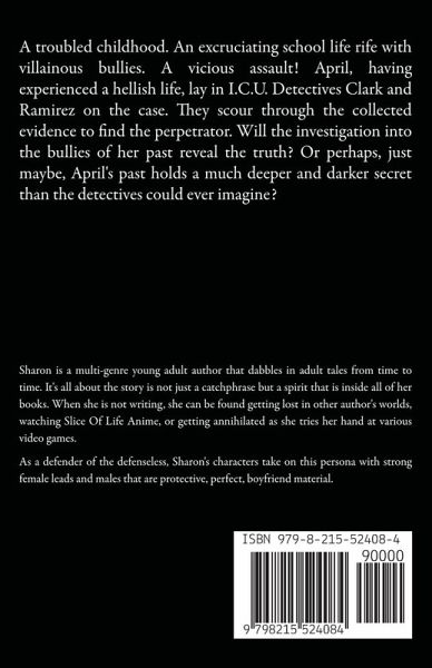 A troubled childhood. An excruciating school life rife with villainous bullies. A vicious assault! April, having experienced a hellish life, lay in I.C.U. Detectives Clark and Ramirez on the case. They scour through the collected evidence to find the perpetrator. Will the investigation into the bullies of her past reveal the truth? Or perhaps, just maybe, April's past holds a much deeper and darker secret than the detectives could ever imagine?