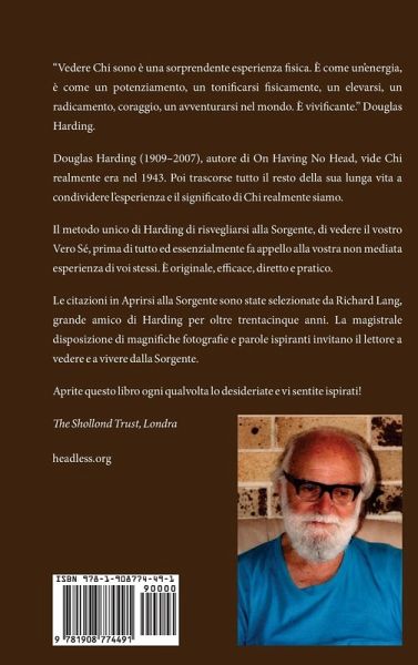 "Vedere Chi sono è una sorprendente esperienza fisica. E’ come un’energia, è come un potenziamento, un tonificarsi fisicamente, un elevarsi, un radicamento, coraggio, un avventurarsi nel mondo. E’ vivificante." Douglas Harding. Douglas Harding (1909–2007), autore di On Having No Head, vide Chi realmente era nel 1943. Poi trascorse tutto il resto della sua lunga vita a condividere l’esperienza e il significato di Chi realmente siamo. Il metodo unico di Harding di risvegliarsi alla Sorgente, di vedere il vostro Vero Sé, prima di tutto ed essenzialmente fa appello alla vostra non mediata esperienza di voi stessi. E’ originale, efficace, diretto e pratico. Le citazioni in Aprirsi alla Sorgente sono state selezionate da Richard Lang, grande amico di Harding per oltre trentacinque anni. La magistrale disposizione di magnifiche fotografie e parole ispiranti invitano il lettore a vedere e a vivere dalla Sorgente. Aprite questo libro e ogni qualvolta lo desideriate e vi sentite ispirati!